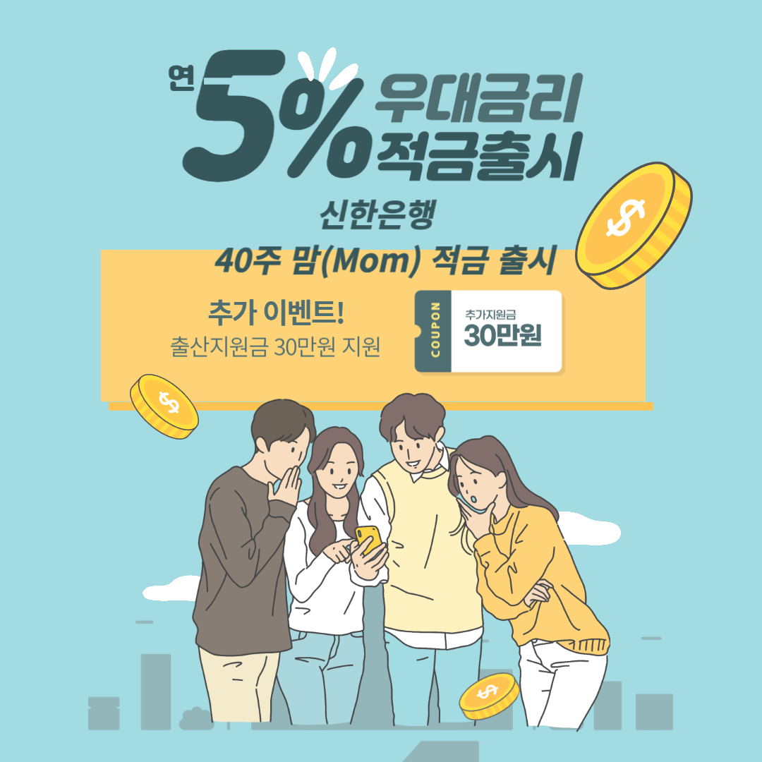 신한은행에서 매주 입금 하는 40주 맘(Mom) 적금이 출시 되었습니다. 최대 5% 까지 혜택을 볼 수 있는 적금이지만 선착순 1만명만 혜택을 볼 수 있으니 예비 부모님들이라면 아래 링크를 통해 꼭 한번 확인 해보는 것을 추천드립니다.