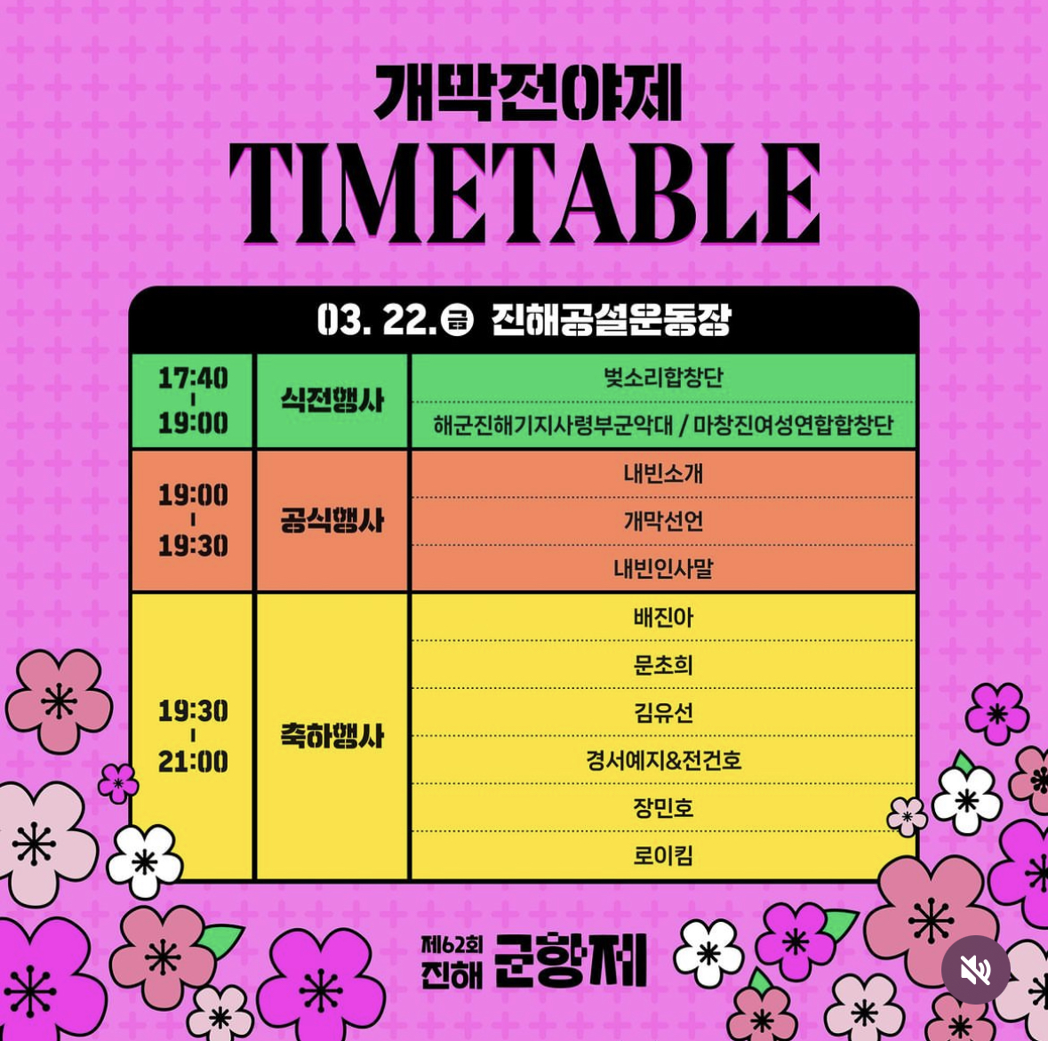 * 체리블라썸 EDM 페스티벌 : 3월 25일(월)~3월 28일(목) 20:00~21:00 / 중원로터리