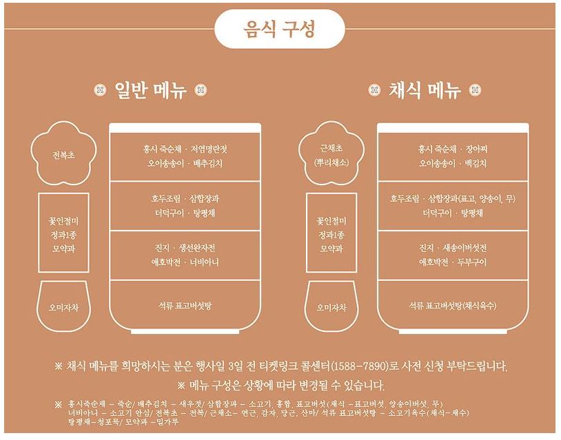 메뉴구성은 상황에 따라 변경 될 수 있으나 일반 메뉴 / 채식 메뉴로 나뉘어져서 제공 합니다. 채식 메뉴를 희망 하시는 분은 티켓링크 콜센터를 통해 사전 신청 하셔야 합니다.