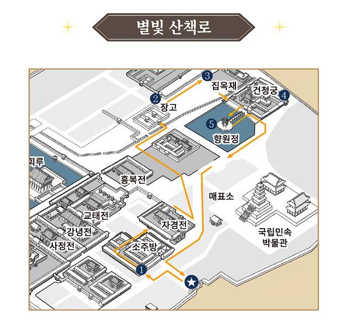 경복궁 전문 가이드와 함께 소주방, 자경전, 장고, 집옥재, 건청궁, 향원정을 지나는 별빛 산책로의 고즈넉함을 만끽 할 수 있습니다.